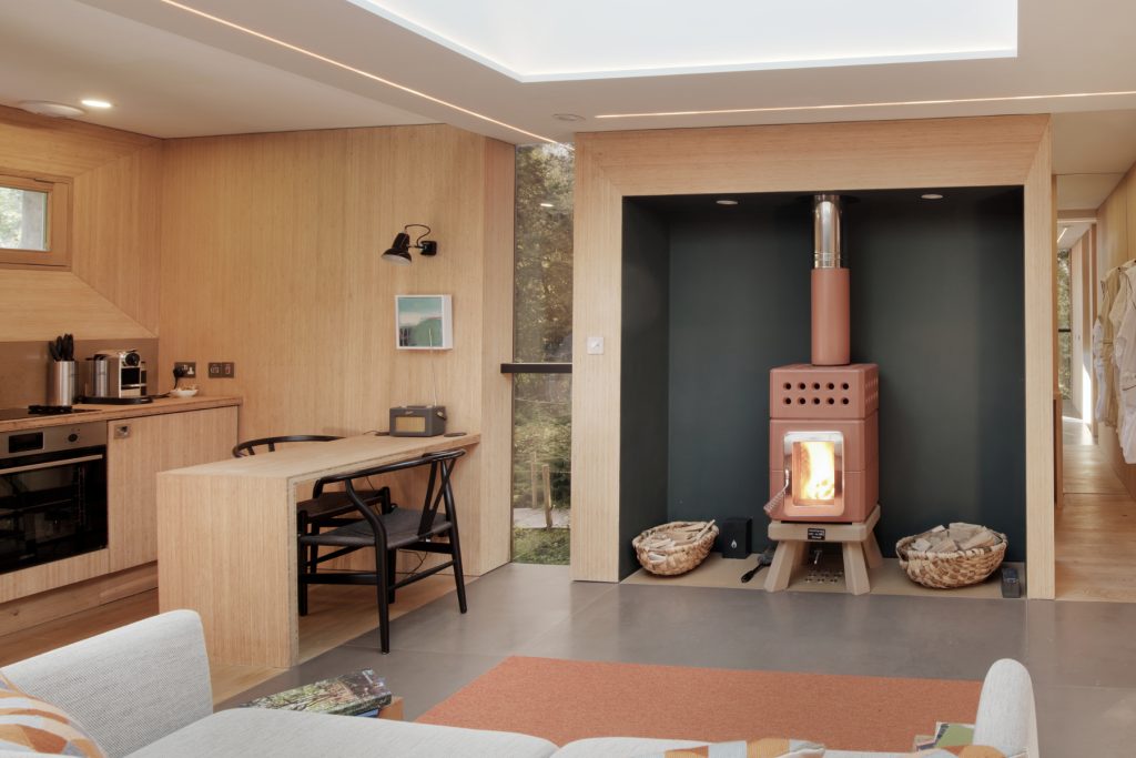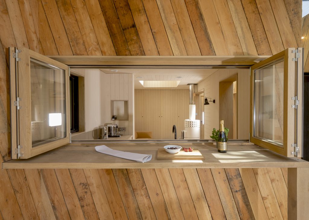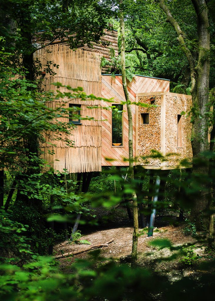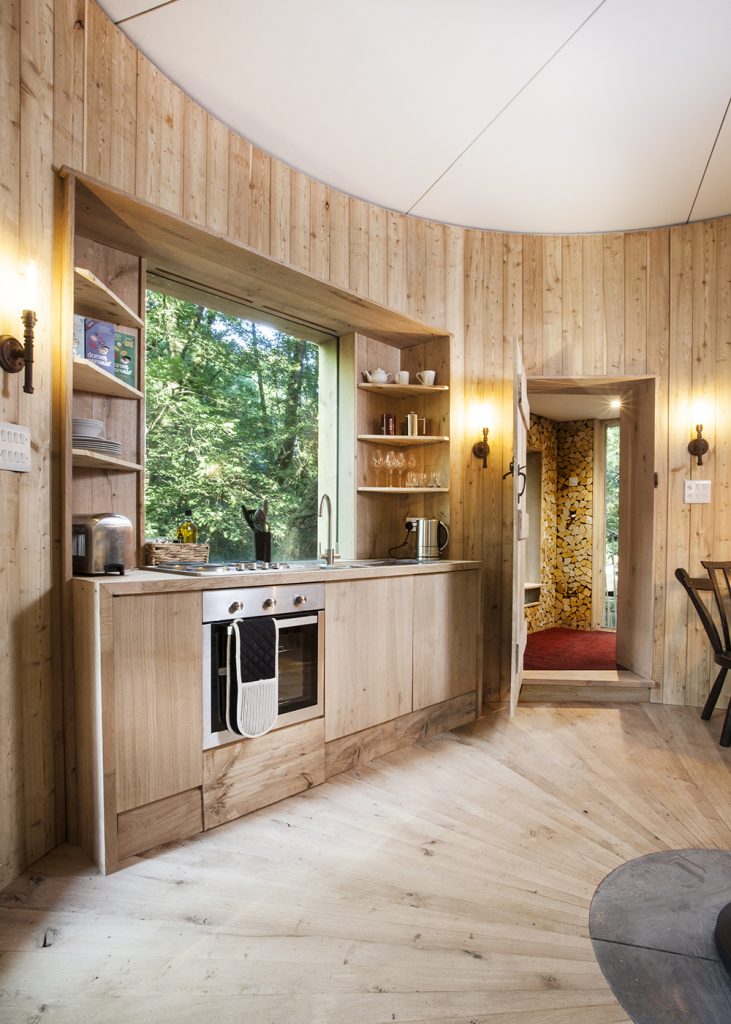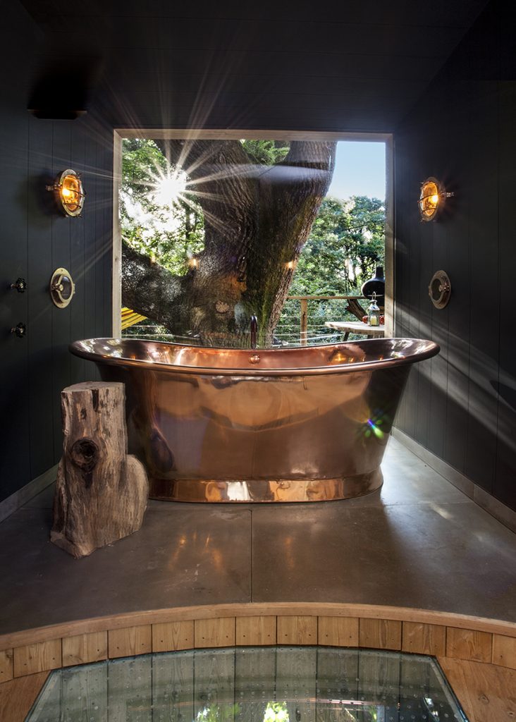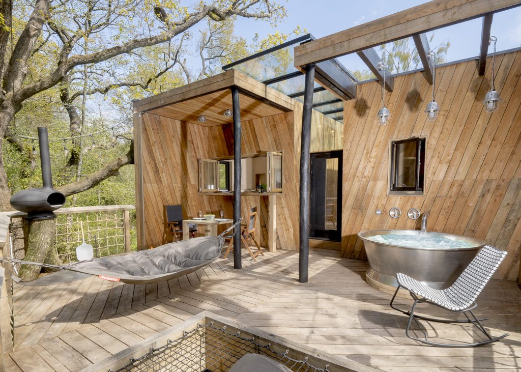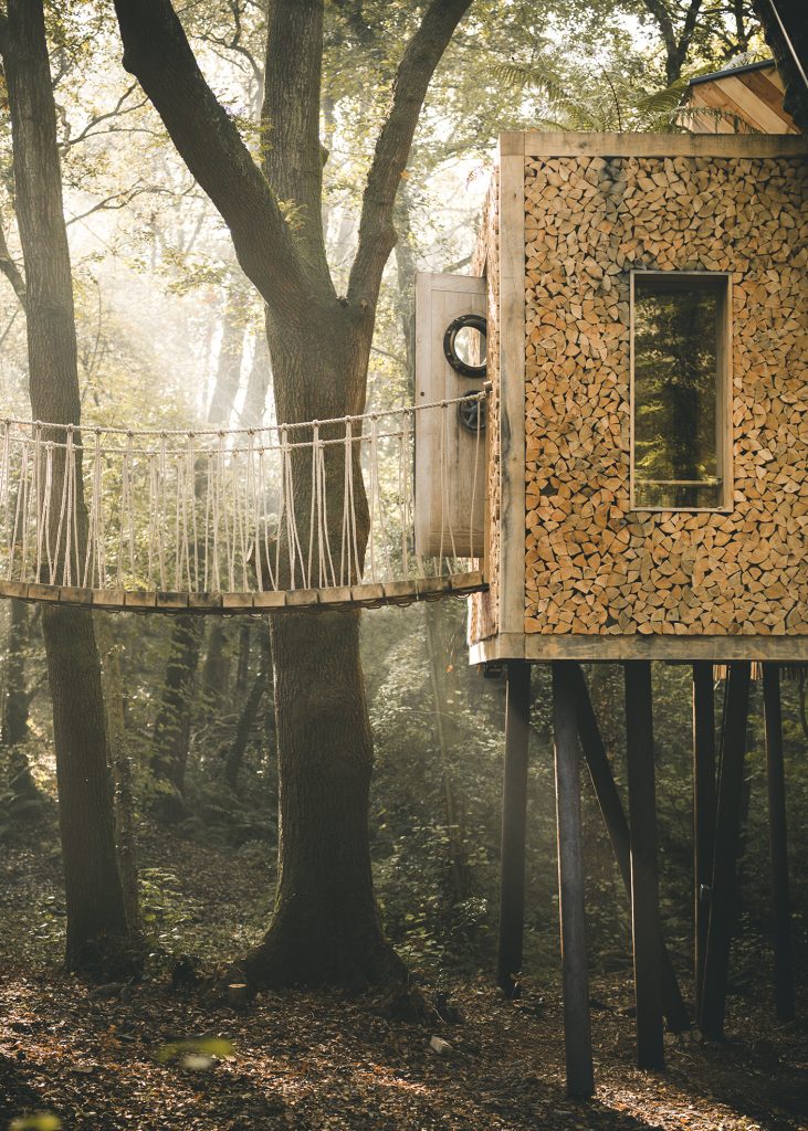 This ship-themed treehouse features gangplank walkways, yacht deck floors, rooftop funnels, and a prow-shaped deck framed by a slender alder tree. A central glass spine draws light through the cabin, while a kitchen opens onto a rear deck with hot tub and cargo net daybed above a stream. Inside, a wood-burning stove warms the sitting room and bedroom, with an ensuite shower and flushing loo. Designed by Guy Mallinson & Keith Brownlie and crafted in 2020, it’s a luxury woodland hideaway.