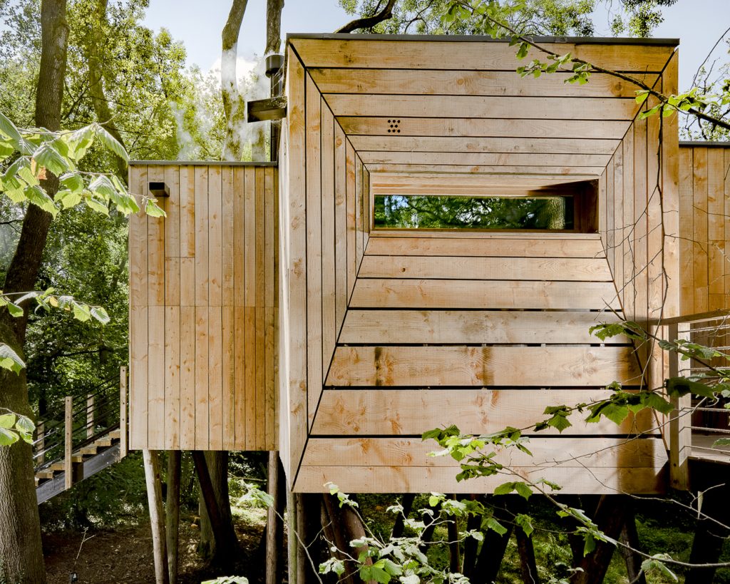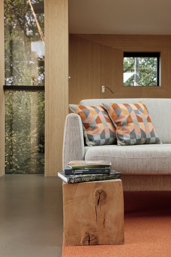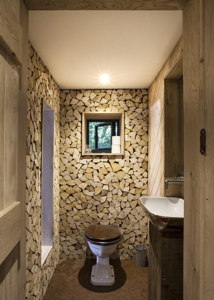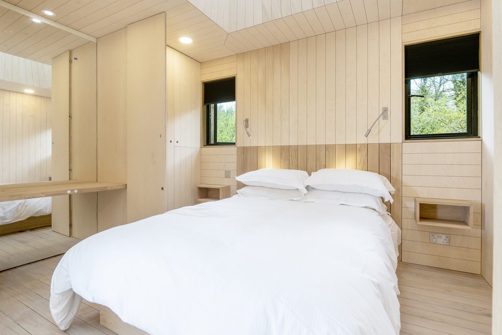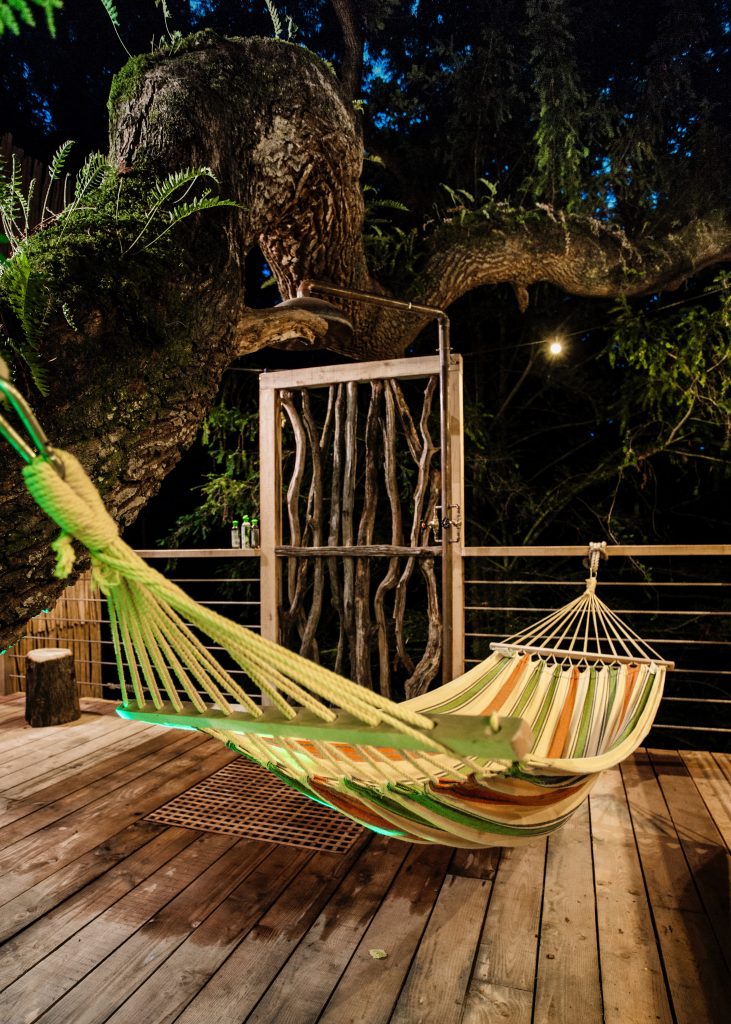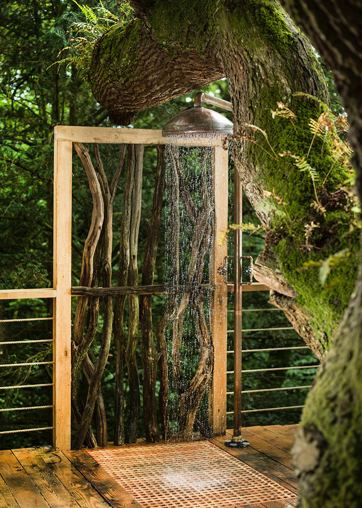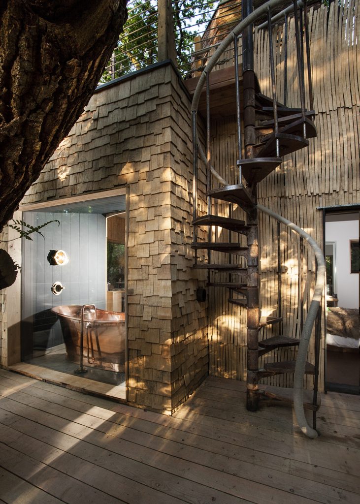 This ship-themed treehouse features gangplank walkways, yacht deck floors, rooftop funnels, and a prow-shaped deck framed by a slender alder tree. A central glass spine draws light through the cabin, while a kitchen opens onto a rear deck with hot tub and cargo net daybed above a stream. Inside, a wood-burning stove warms the sitting room and bedroom, with an ensuite shower and flushing loo. Designed by Guy Mallinson & Keith Brownlie and crafted in 2020, it’s a luxury woodland hideaway.