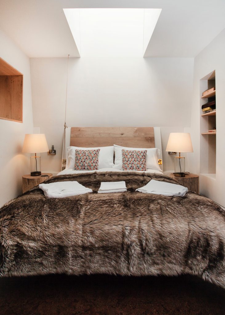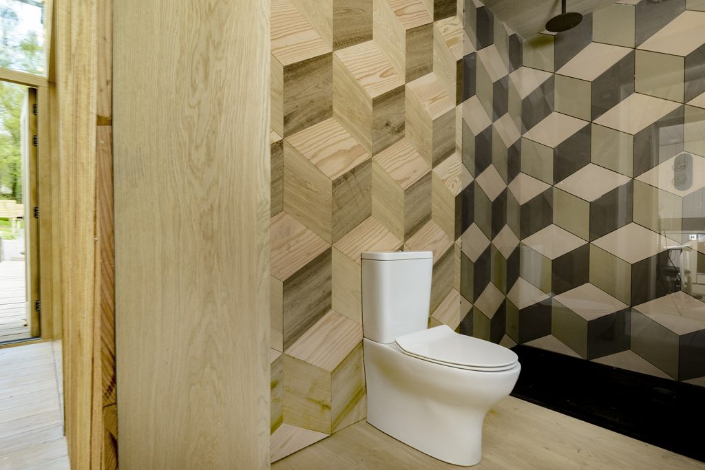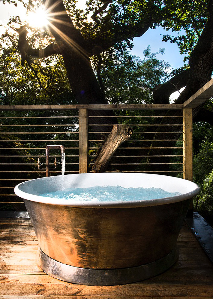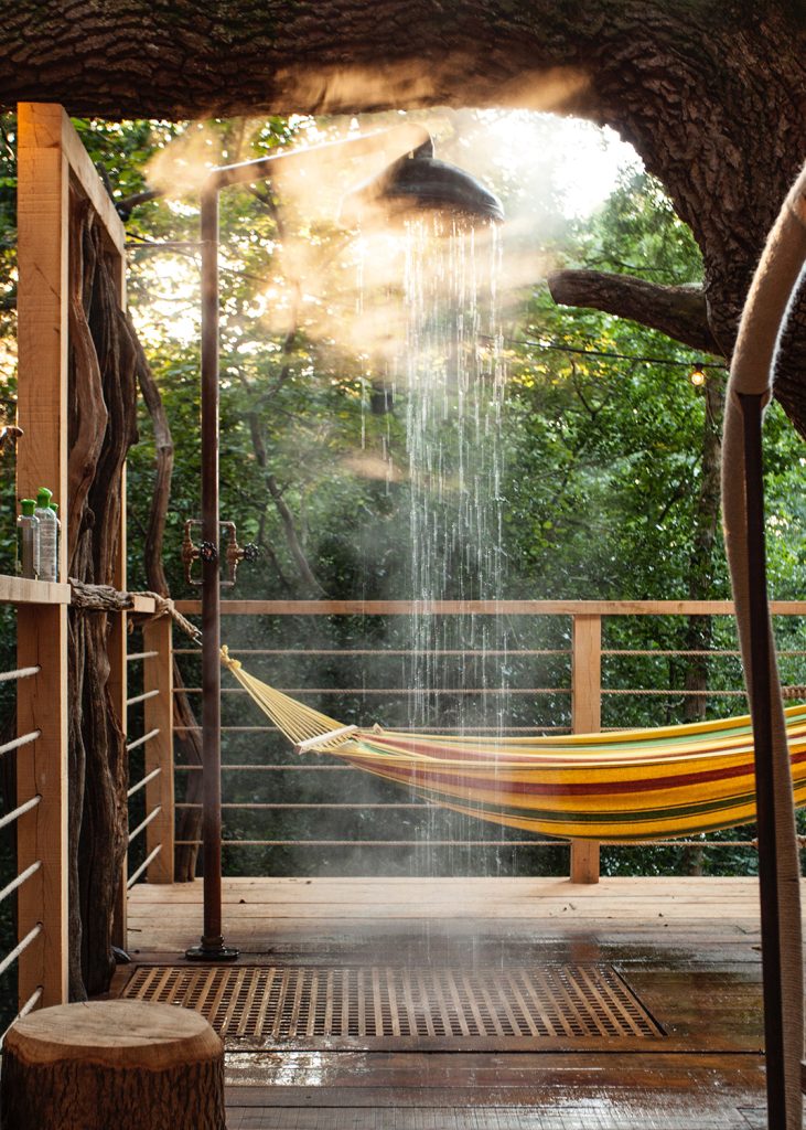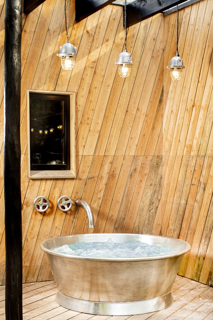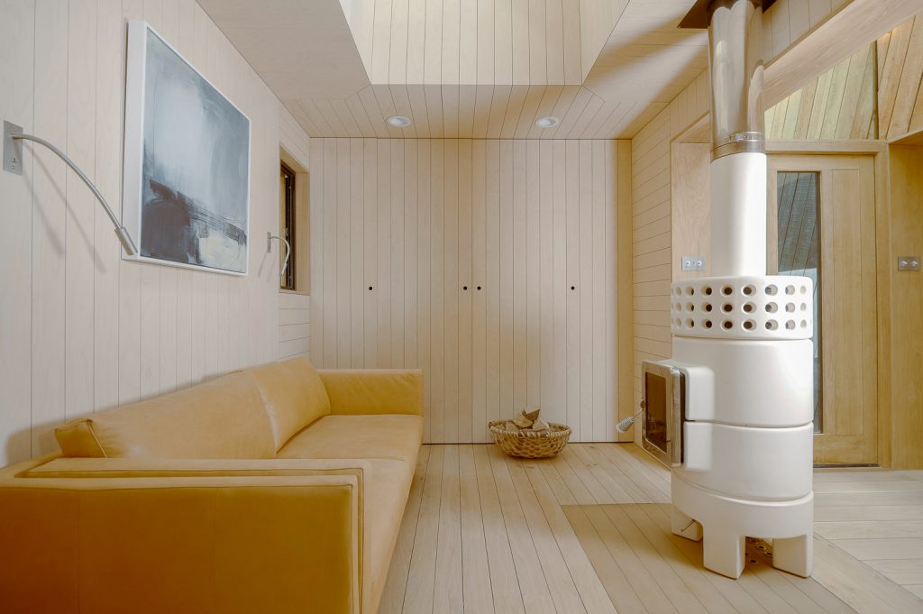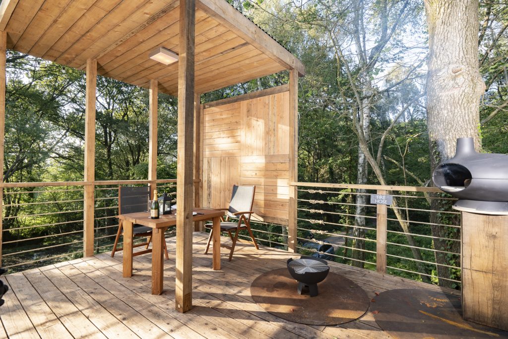 This ship-themed treehouse features gangplank walkways, yacht deck floors, rooftop funnels, and a prow-shaped deck framed by a slender alder tree. A central glass spine draws light through the cabin, while a kitchen opens onto a rear deck with hot tub and cargo net daybed above a stream. Inside, a wood-burning stove warms the sitting room and bedroom, with an ensuite shower and flushing loo. Designed by Guy Mallinson & Keith Brownlie and crafted in 2020, it’s a luxury woodland hideaway.