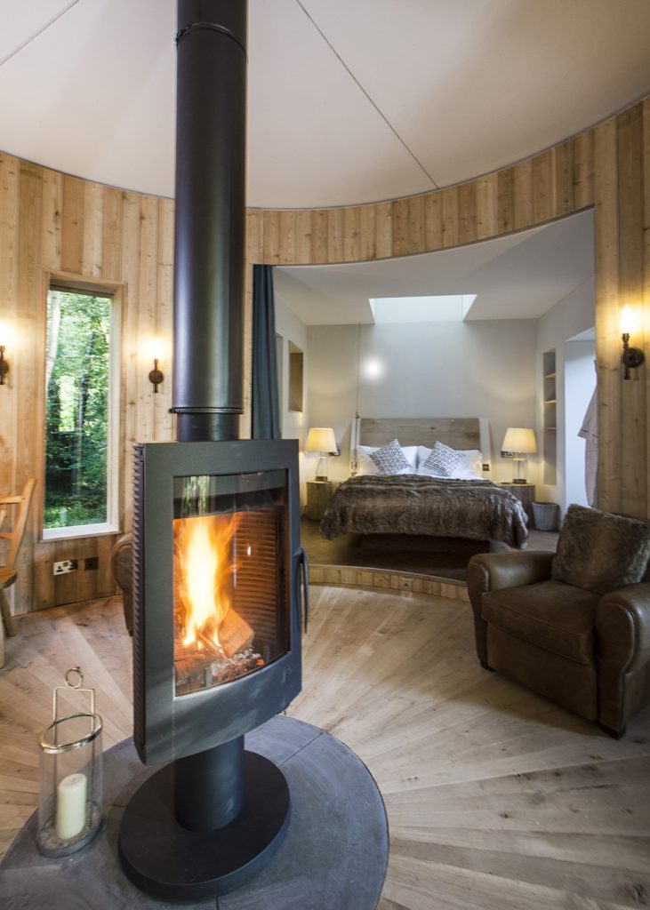 Cross a rope bridge to this award-winning treetop chalet, where sustainable craftsmanship meets luxury. A circular room with rotating wood burner sits at its heart, with king bed, roll-top bath, kitchen, and en suite loo. Outside, enjoy a sauna, hot tub, tree shower, hammock, pizza oven, barbecue, and woodland slide. Opened in 2016, it was designed by Guy Mallinson & Keith Brownlie, built by master craftsmen, and featured on Amazing Spaces and Grand Designs House of the Year.
